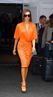 Ever since orange was dubbed the new red during the Spring 2011 runway shows, the bright shade has been a burning obsession for all of Hollywood's most stylish celebrities. The explosive and bold color not only demands attention, but also compliments a variety of skin tones while accentuating your natural glow. Whether it's against Kate Bosworth and Britney Snow's perfectly pale pigments or the bronze tones of Zoe Saldana, orange is bound to give you a sunset glow that no other color can compete with. If your skin complexion falls into the olive or darker category opt for deeper shades of orange and save the lighter and brighter shades for those with a paler complexion. Above I'm wearing a vibrant orange dress from H&M which I cinched in with a skinny Forever 21 belt and paired with my favorite pair of black Mary Jane pumps. Girls, it's time to be daring this fall. Incorporate a citrus burst into your wardrobe, whether it be a dress or a cropped trouser. For a more subtle approach try making your neural ensembles pop by accessorizing them with an orange envelope clutch or ankle boot. I also strongly suggest trying OPI's "on the same paige" nail polish or Estee Lauder's "orange crush" lip gloss. Both are utterly uh-mazing. Below are pictures of celebrities rocking the bright and bold trend. Which look is your favorite?
